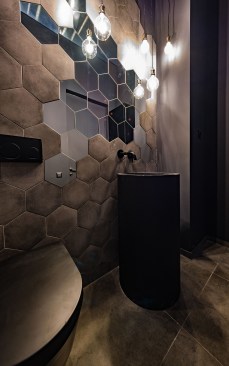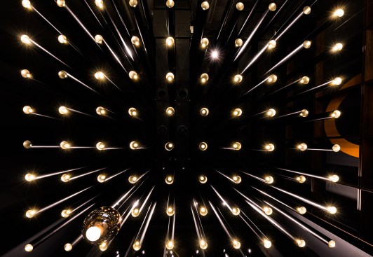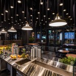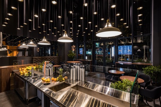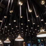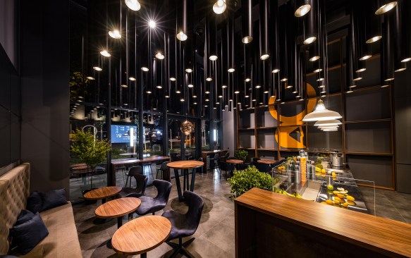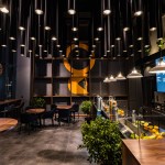We think that the uniqueness of the ceiling with its hanging 3-meter 90 plastic sewage pipes makes the juice bar absolutely distinct and original. This is how we dealt with the issue of premium look and classy design with the cheapest materials. Moreover, We took those 90 pipes and transformed them into massive spot lightings just by inserting ordinary bulbs inside, that creates immersive lighting contrast and a sense of endless ceiling.
