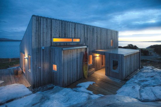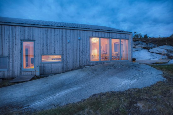 The building sits amidst marshland, sea-adjacent rock and scattered pine and juniper vegetation. An important consideration in the project was to avoid interfering with this sensitive surrounding terrain. It heals slowly due to climatic factors. The cottage lies 21 meters above sea level, and the distance to the sea front is 100 meters. Some marsh had to be cleared in preparing for the building phase, exposing bedrock and thus aiding in integrating the cottage with the terrain.