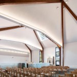 In order to brighten the sanctuary, a large triangular skylight was installed in the center of the room, lighting the location of the prayer leader. The existing colored vertical windows were replaced with clear glass, and the outdated candelabra chandeliers were removed. New minimal LED linear cove uplights were installed, washing the original building’s angled roof geometry and illuminating the room with indirect light. The tan brick walls were painted with a coat of white lime wash, brightening the space while respecting its past.
