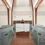 The sanctuary’s focal point is the ark where the sacred Torah scrolls are held. The design of the ark and reading table responds to the existing structure’s geometry. Their irregular geometry also drew inspiration from the Kabbalistic idea of “broken vessels,” which symbolizes people’s responsibility to repair the damaged world. The ark and reading table are connected by a raised oak platform that is accessible by an ADA ramp. Custom-made glass partitions separate the men’s and women’s sections, while allowing both sides to see the service. The frosted glass has the Friday evening service etched onto it, creating a pattern of translucent forms made of Hebrew letters.