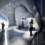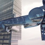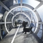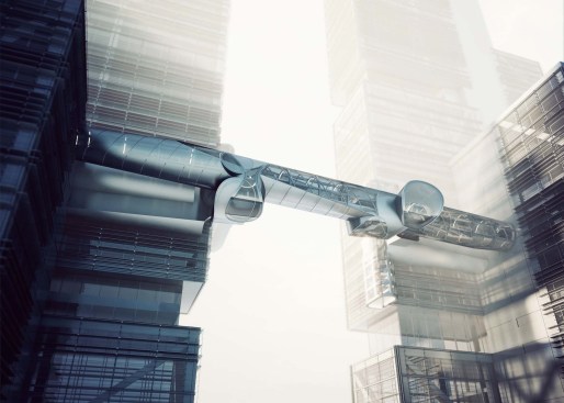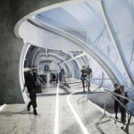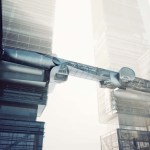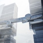 The body of the bridge is generated by the intersection of a set of conic volumes positioned relatively along their common axis, which is itself directed between the cores of the two towers. At two points along this axis, perpendicular cones are introduced and split by the same primitive cones that generated the volume of the bridge. These perpendicular cones extend beyond the body of the bridge to create large platforms from which drones can be flown and observed, and which serve as meeting areas with expansive views of the surrounding city. The platforms' vertical extension beyond the main body of the bridge allows people to experience the view from various vantage points. Adjacent to each platform, the bridge "plugs in" to two enclosed structures that allow for additional circulation back to the towers. The two structures allow both vertical and horizontal circulation, and are attached to the exterior of the towers.