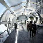 The length of the bridge is split into two levels, meeting the first tower at the 28th floor and the second tower between floors 28th and 29th, with a staircase connecting both floors to the body of the bridge. The two levels within the bridge are connected by a large ramp that spans the two viewing platforms. Views into each partially-enclosed platform are generated by the level shift, and visible when traversing the ramp.
