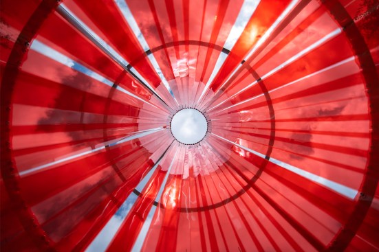 The installation gives space and time to each individual to stare at the sky alone, while being surrounded by a hanging translucent orange membrane that diffuses the light and creates a soothing environment. The installation is a low-cost lightweight structure that can be easily assembled and transported. It consists of a white steel frame and vinyl orange membrane stripes that hang loosely from the top ring, covering the upper part of the body but leaving the legs visible to the public making clear that the tower is occupied. The translucency of the membrane allows a subtle connection with the exterior while at the same time provides a place of retreat. A VR environment was developed in parallel, that gives the visitors of the festival the opportunity to modify the structure and define their own personal space according to their needs and preferences.