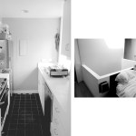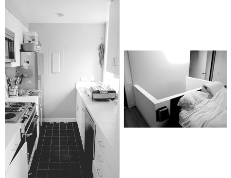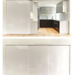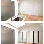 the apartment’s second floor. Those closets lie behind white pivoting doors,