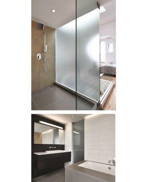 while the master bath’s privacy is maintained behind a frosted glass door and