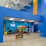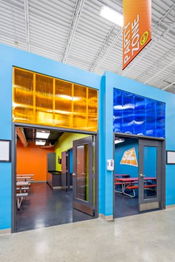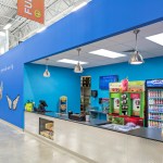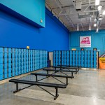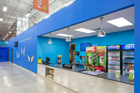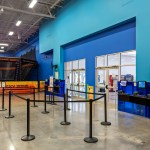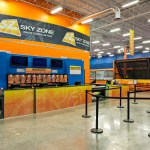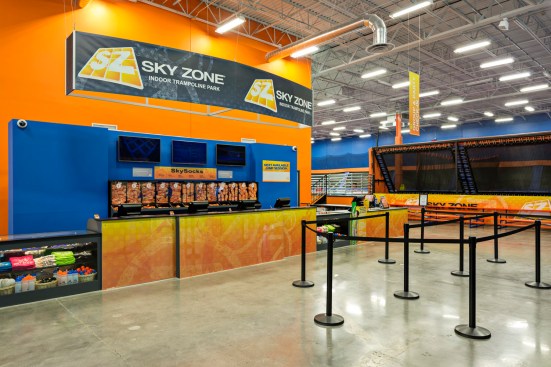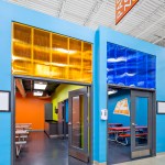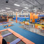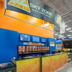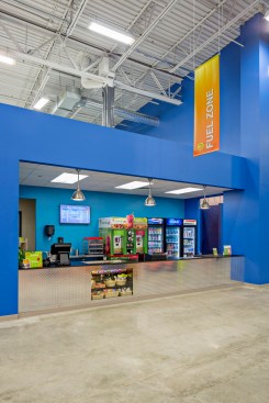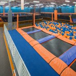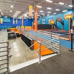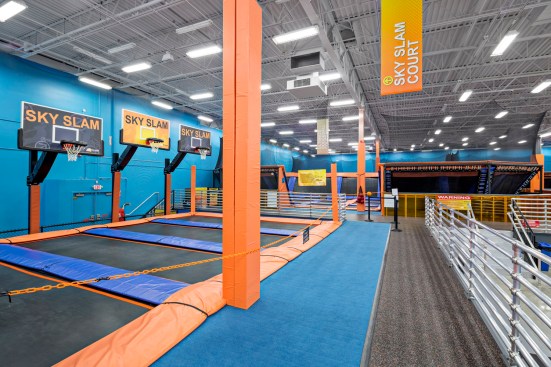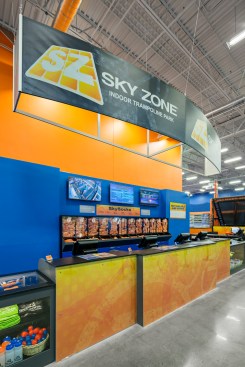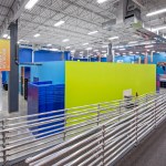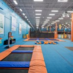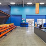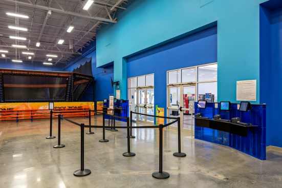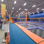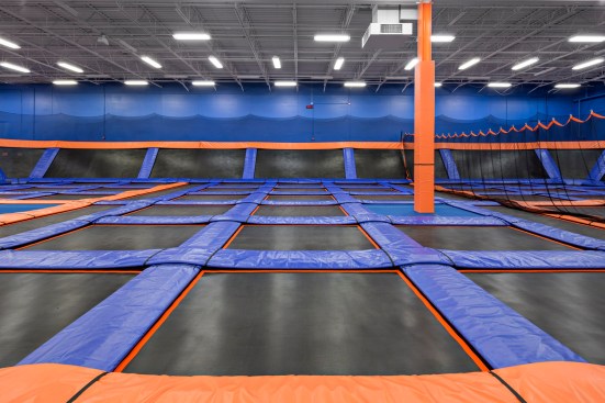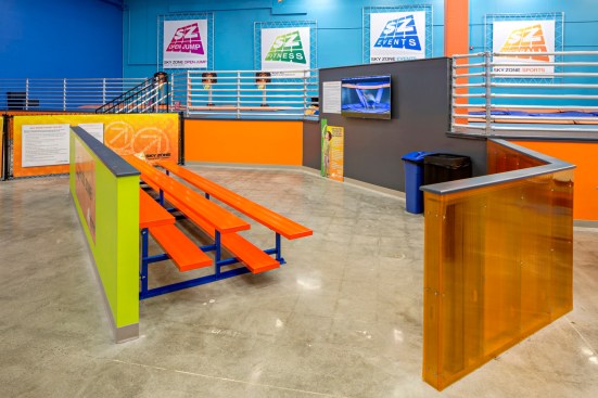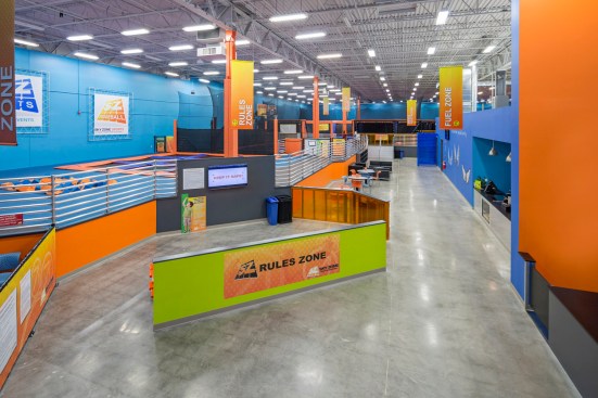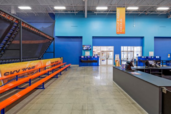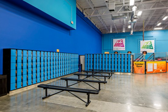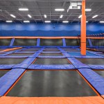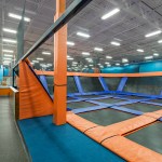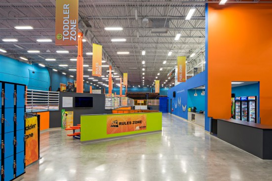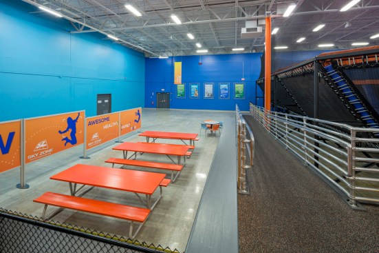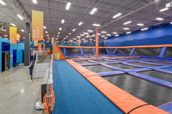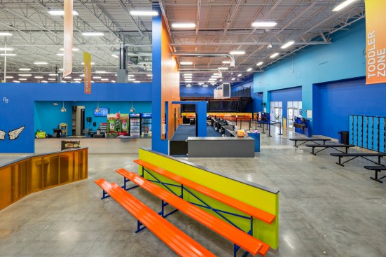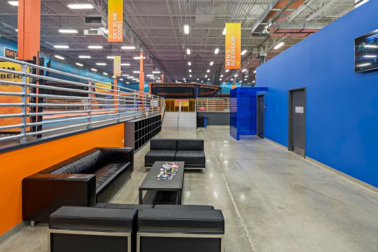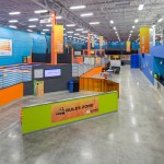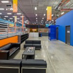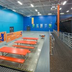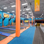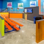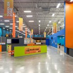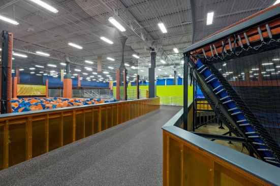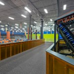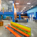 Embarc Studio designed this new 40,000 square foot indoor trampoline park in Danvers, MA. This cost effective design solution involved the renovation of an existing big box retail space where the tall ceiling heights provided the clearance needed above the trampolines while also allowing a viewing mezzanine to be constructed within the space.