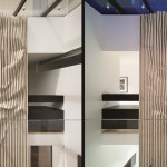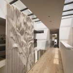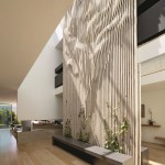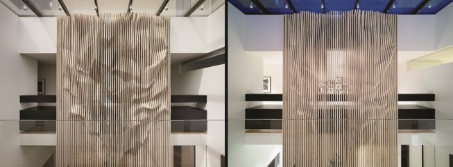 and a reclaimed pine sculpted wood wall that filters and carves light help to reinforce