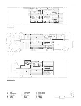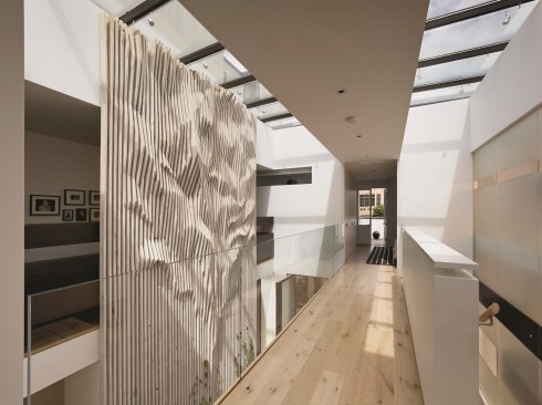 spatial hub, pulling daylight deep into the home’s interior. A transverse bridge