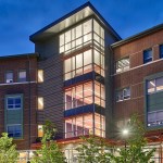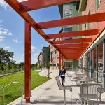 The building form and footprint follows the contours of the site to minimize the impact of the building on the site. The facade features four types of brick matching many of the surrounding buildings but uses them to articulate common spaces and private spaces. An entry plaza, trellis, and lawn at the main entry help to create public exterior spaces for students to use with expansive views of the remainder of campus.