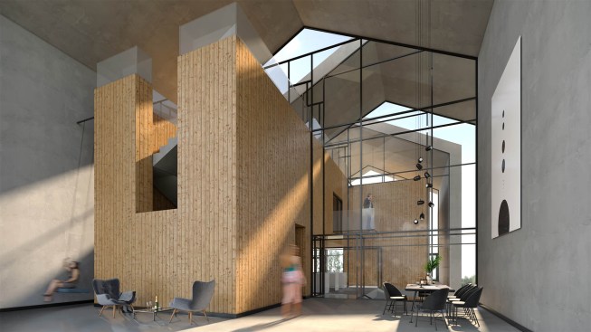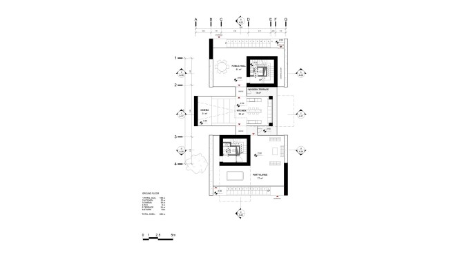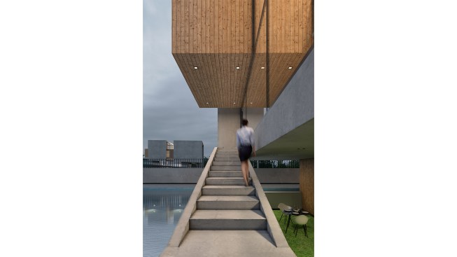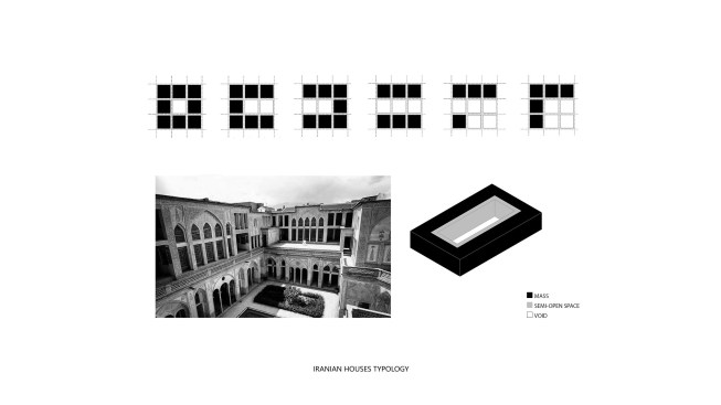 of programs replaced this dual structure, with private and public separation becoming private, semi-public/private and public. These were the two main ideas of the villas, each transformed to form with different method. Villa No. 2 (smaller) design by composing two types of courtyard and northern house typology that cause dual nature. The combination of these two types have opportunities that help us to organize program. Public and semi-public were defined within the In-Between spaces, and private programs within introverted typology were more enclosed. The project structure is a combination of a concrete core structure and metal trusses, with no other structural elements seen in space. The materials used in these two projects are wood and concrete, creating a dialogue between modern architecture and the context, as well as enhancing the connection between the two projects.