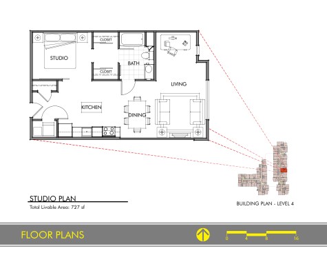 This mixed-use development features ground floor commercial space and three residential floors consisting of 108 studio and one bedroom apartments. Residents experience building-wide fast Wi-Fi connectivity, open floor plans with natural light, energy-efficient fixtures, and decks or private terraces.