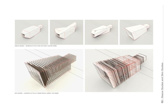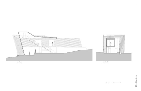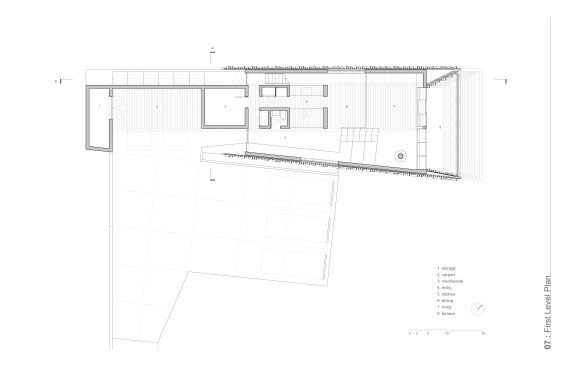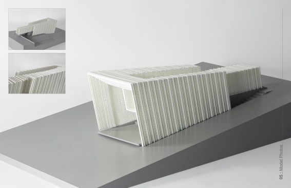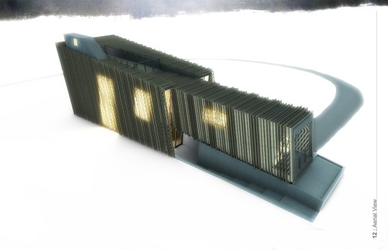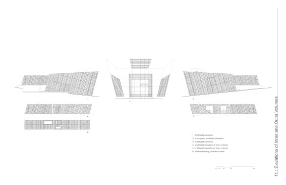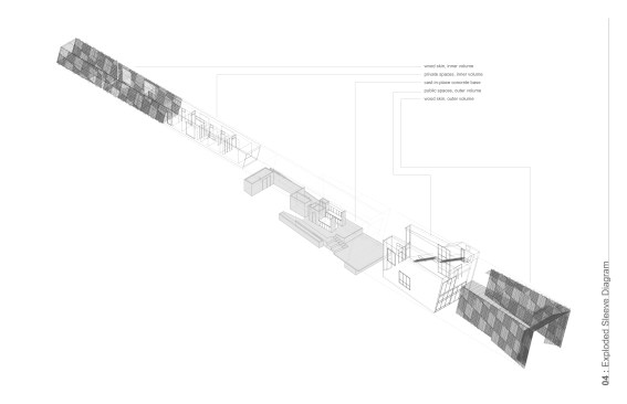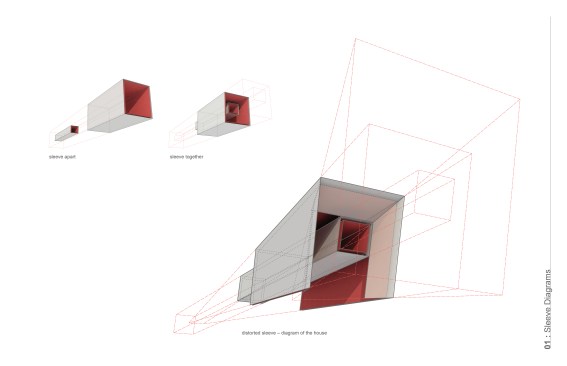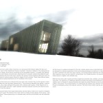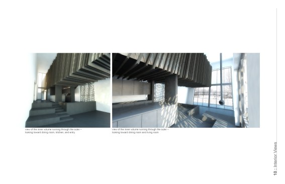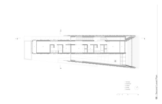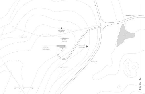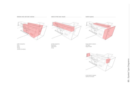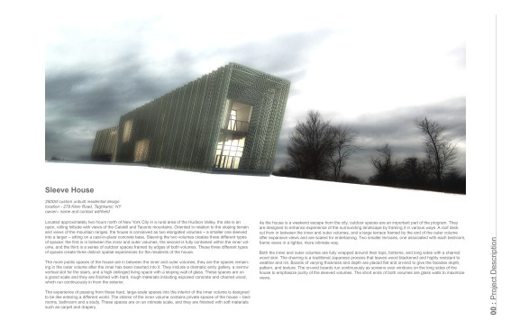 Located approximately two hours north of New York City in a rural area of the Hudson Valley, the site is an open, rolling hillside with views of the Catskill and Taconic mountains. Oriented in relation to the sloping terrain and views of the mountain ranges, the house is conceived as two elongated volumes – a smaller one sleeved into a larger – sitting on a cast-in-place concrete base. Sleeving the two volumes creates three different types of spaces: the first is in between the inner and outer volumes, the second is fully contained within the inner volume, and the third is a series of outdoor spaces framed by edges of both volumes. These three different types of spaces create three distinct spatial experiences for the residents of the house. The more public spaces of the house are in between the inner and outer volumes; they are the spaces remaining in the outer volume after the inner has been inserted into it. They include a dramatic entry gallery, a narrow vertical slot for the stairs, and a high ceilinged living space with a sloping wall of glass. These spaces are on a grand scale and are finished with hard, rough materials including exposed concrete and charred wood, which run continuously in from the exterior. The experience of passing from these hard, large-scale spaces into the interior of the inner volume is designed to be like entering a different world. The interior of the inner volume contains private spaces of the house – bedrooms, bathroom and a study. These spaces are on an intimate scale, and they are finished with soft materials such as carpet and drapery. As the house is a weekend escape from the city, outdoor spaces are an important part of the program. They are designed to enhance experience of the surrounding landscape by framing it in various ways. A roof deck cut from in between the inner and outer volumes, and a large terrace framed by the end of the outer volume offer expansive views and are scaled for entertaining. Two smaller terraces, one associated with each bedroom, frame views in a tighter, more intimate way. Both the inner and outer volumes are fully wrapped around their tops, bottoms, and long sides with a charred wood skin. The charring is a traditional Japanese process that leaves wood blackened and highly resistant to weather and rot. Boards of varying thickness and depth are placed flat and on-end to give the facades depth, pattern, and texture. The on-end boards run continuously as screens over windows on the long sides of the house to emphasize purity of the sleeved volumes. The short ends of both volumes are glass walls to maximize views.