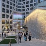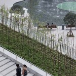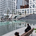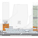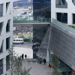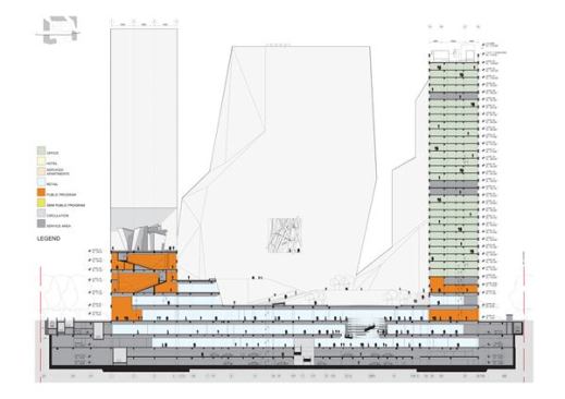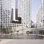 The complex comprises residential, office, and hotel programs along the edge of a block, with a raised plaza above a six-floor retail podium; three water gardens within the plaza double as skylights for the shopping center below. Three pavilions are framed within niches carved into the towers, including the Light Pavilion designed by the late Lebbeus Woods—an abstracted structural expression of movement with illuminated, nonlinear steel supports that defy the orthogonal geometry of the towers’ concrete exoskeleton. Vertical cuts through the tower bases reveal retail along the sides of ramps and throughways that connect the tower block to the rest of the city, prioritizing pedestrians and creating a system of pathways and circulation that forms a cityscape within a city that struck a chord with the jury.