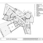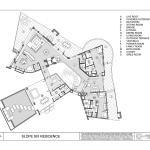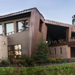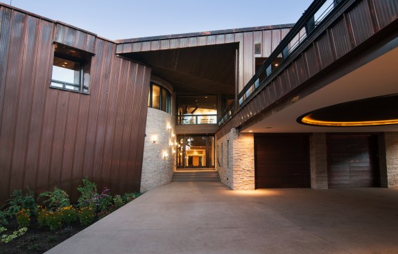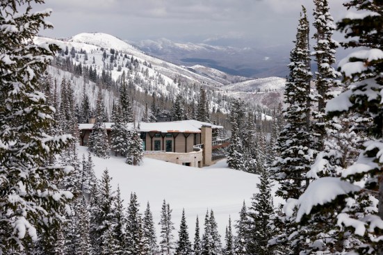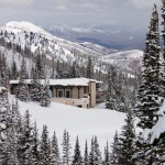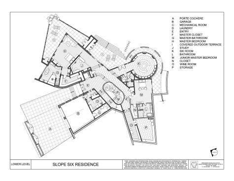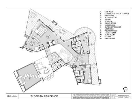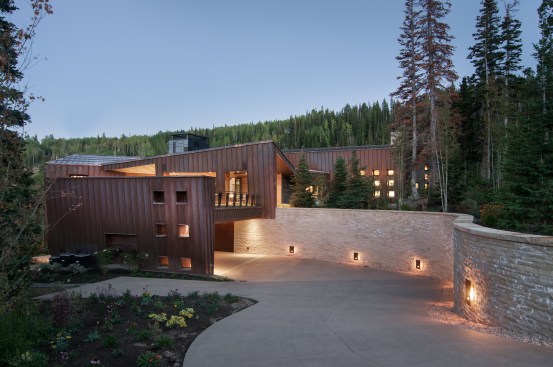 This ski-in/ski-out residence is located in Park City, Utah at the top of a mountain with an elevation of 9,450 feet. Since the home will get between 300 and 500 inches of snow on it annually, the home is designed to literally “get buried.” The copper clad roofs slope toward the back (upslope) of the house and fold down the rear walls to protect the home. The snow is collected behind the house (a phase two collection pond is designed) and as it melts will become a pond, slowly drained off for irrigation water over the summer allowing the whole cycle to begin again each winter.