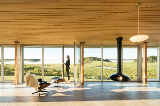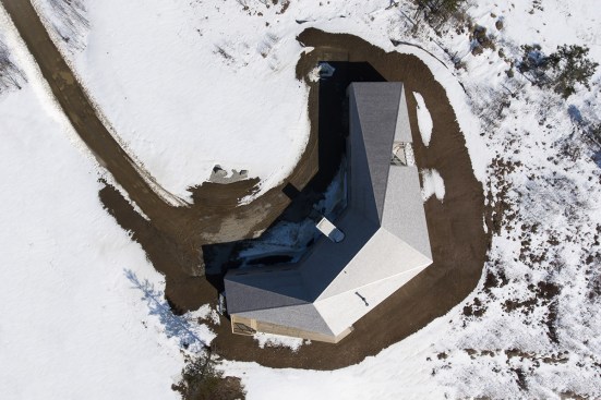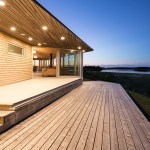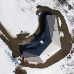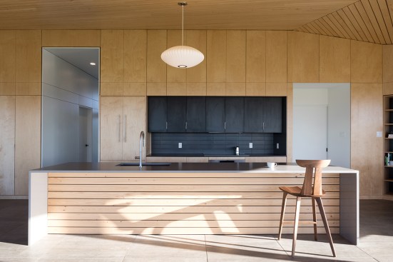 The semicircular design of the residence places the living areas along the ‘views’ side while weighing the services to the back of the floor plan. The structure is composed of flanking bedroom wings and a central indoor/outdoor great room space which is clad entirely in local clear spruce and birch millwork. The monolithic look has a feeling of the space being carved from the wood exterior form.