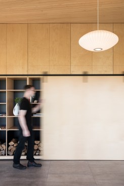 The client had several requirements that we were able to integrate into the early stages of design. The great room space was to be open, versatile, and free from distraction when required to emphasize the exterior view. This translated into a space which could be transformed from a fully programmed interior space to one which was completely concealed and minimal. Flexible elements such as a series of sliding panels, barn doors, and a central, rotating fireplace allow the centre of activity and gravitation to shift easily and flow naturally.