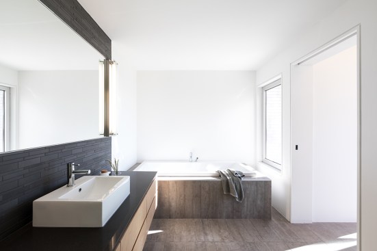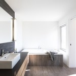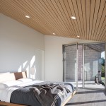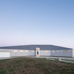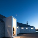 As one approaches the residence they are faced with a low-slung roof, gently canted wall, and a minimal amount of glazing in the form of broken dashed dot ribbon. The apex of the elevation is highlighted with a shining white hoop marking the entry and piercing the centre of the home.