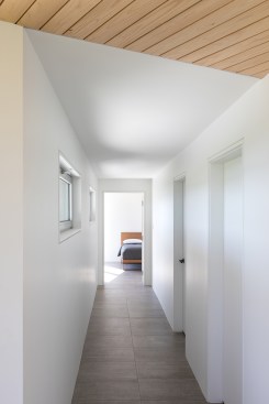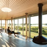 The entry hoop is in the orientation of a tall corridor, compressed on the sides. In extreme contrast, as one enters the space, passes through the threshold, and enters the great room, they are presented with a long, low horizontal panorama of the marshy coastline and island dotted ocean view. Until the point of entry, the panoramic view of the landscape is withheld from the visitor as the width of the house conceals the dramatic sight.