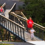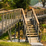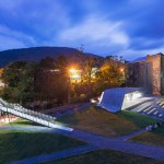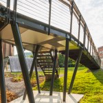 The project is the second phase of the redevelopment of a post-industrial brownfield into a public park, which aspires to inject a distinct sense of identity and place at the heart of the community. This phase of the project includes a pedestrian bridge, park space and a creek access. The idea driving the design is that the built elements emerge out of the landscape of the park. The bridge is a bent path, which ramps and steps, inviting people to wander as well as providing a direct link, over the creek, between the new ampitheatre and the historic downtown. It is supported at mid-span by a forest of leaning columns, which create a sheltered repose along the creek. Transparency was an integral part of the overall concept; the bridge deck and rail assembly maintain a thin profile, giving the bridge a subtle presence on the site. The entire length of the bridge is ramped to accommodate the site’s significant elevation changes. The park is divided into multiple landscaped areas, including a line of tall grasses along the creek, a labyrinthine butterfly garden adjacent to the amphitheatre, a beach along the creek, and a series of grass lawns at the center.