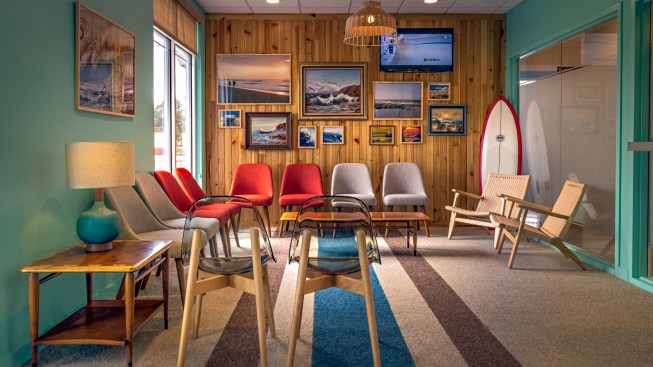 The bold decision was made early in the design process to infuse the environment with a beachside vibe. Inspired by founders Steve Cram and Dr. Rob Smith’s love of the ocean and passion for water sports, Smith Dental offers patients a unique experience. One-of-a-kind art pieces, vibrant treatment rooms named after famous surf spots and refinished furniture accents reflective of surfing and skateboarding culture combine to reduce the stress of patients and present an unexpected twist of fun into their visit.