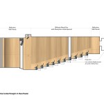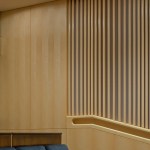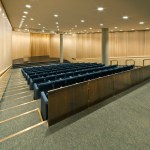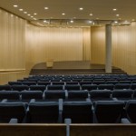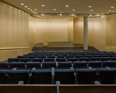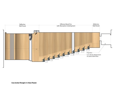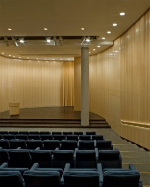The infill project was designed to achieve acoustic isolation, visual openness and personal comfort. A displacement central air system provides low-velocity air below the seats and serves to isolate the noise and vibration from the nearby central mechanical plant. A stretch fabric ceiling includes a recessed theatrical lighting system and masks the visual discontinuity between the absorptive and reflective materials above.