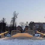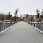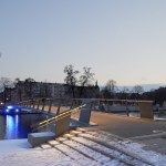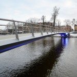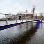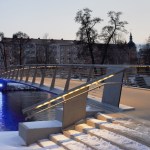 The bridge has vibration dampers to counteract vertical oscillations. The structure employs a welded hollow beam and 12mm thick plates covering the underside of the bridge. The handrails feature a built-in LED lighting system, illuminating the walkway and guiding pedestrians and cyclists over the snow-free bridge.
