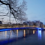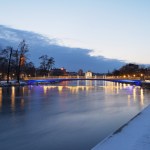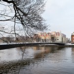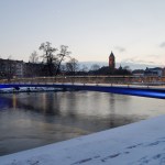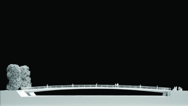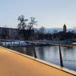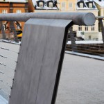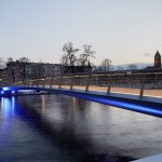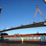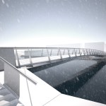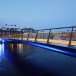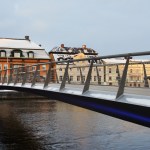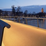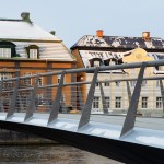 The Tullhus Bridge is a 1st prize winner in an invited architectural competition organized in 2008. This new bridge is located in Norrköping and takes pedestrians and cyclists from Strömsholmen to the north quay in the city centre. The bridge has been part of the urban planning already since the early 50’s, but it wasn’t until now, when the city begun building a new residential area around Strömsholmen, the plans were brought into effect. In 2008 the municipality invited Erik Andersson Architects to an architectural competition and the construction of the long awaited bridge, which will link the new area to the existing city centre, could begin in 2012 The 72 meter long bridge is constructed of steel and has an hourglass-shaped body tapering towards the center both in plan and section. The middle portion depth is 0.86 m. The bridge is painted in silver metallic and its shiny underside reflects the water in Motala Ström that has played a central role in the life of the city since the Middle Ages. A built-in hot-air system makes it possible to heat the bridge and keep it clear from snow in the winter. The first air-heated bridge in Sweden required a complicated construction process. It was prefabricated in one piece and, after welding and sandblasting, transported in one single piece 3 km through the streets of Norrköping before reaching the building site. The bridge connects two banks of distinctive character. On one side sits an old industrial dock, while a natural shoreline marks the other. The body consists of welded plates, which have been sandblasted and painted, while the walkway is draped by a layer of acrylate. The width of the walkway as well as the height of the beam increase towards the middle of the bridge. The beam height is 1.6 m at the supports and 0.86 m at the middle of the bridge.