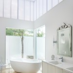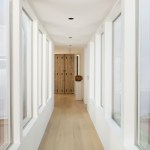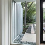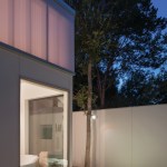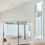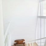 The entrance at the center of the ground level connects via a glazed bridge to the addition: a new master suite that’s been grafted onto the original structure. Clad in white stucco (matching the original house) and metal roofing, the addition has more translucent polycarbonate panels on the north walls as well as skylights whose baffles filter the harsh Texas sun. The new master bedroom extends to the exterior, where high walls create a private series of outdoor rooms as part of the extended suite.