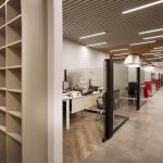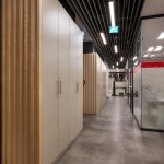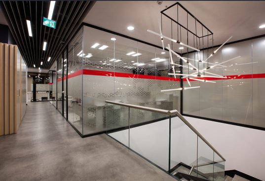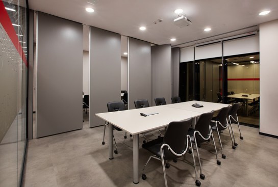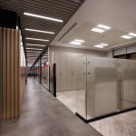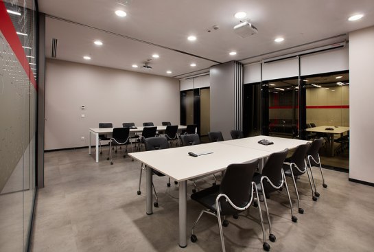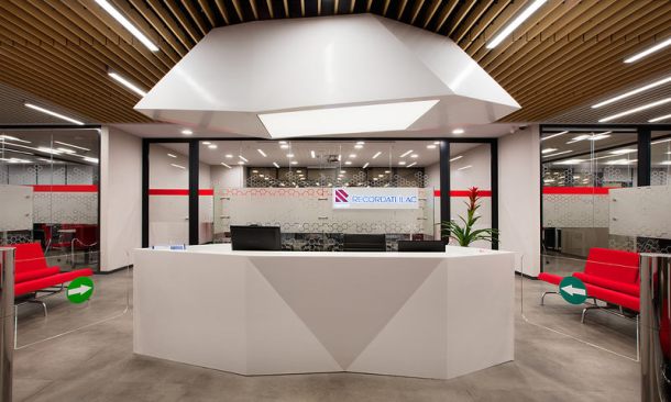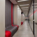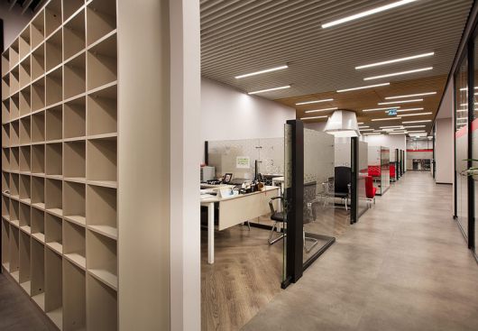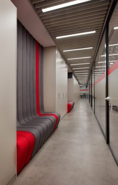 Boytorun Architects has converted Recordati Office into a spacious and extraordinary workplace for users by combining dignity and dynamism in functionality, which is open to social interaction and the spirit of collective work. Boytorun Architects sets a spacious space with the transparent partitions used throughout the room, the walls painted in light colours and the working areas positioned by the windows while it offers a colourful, free environment with the exposed working spaces designed beyond the office setting, in Turkish Head Office of Recordati, an Italian-based pharmaceutical company. Boytorun Architects has positioned the units such as core, WC, IT etc. in the heart of the general setting and the office areas on the frontage at the Recordati Office with an area of 1500 m2, which spreads out on two storeys at the Maslak Building Office. Besides the use of transparent partitions in the manager rooms and meeting rooms as well as the inclusion of exposed working spaces along with the working areas in the office setting make the Recordati Office more spacious. Impressive spots are created with the local use of corporate colour of the company, in the project which has a modern and flexible design. In addition the transparent partitions and the foil veneers fixed on these partitions, which remind molecular sequence, used at the Recordati Office where the employees make the most of sunlight in full efficiency thanks to the light-colour wall paints that are used in a way to reinforce the transparent frontage of the building, make this office more vivid. The sandstone colour used on the furniture is intended to create an appearance in harmony with all the elements, without stuffing the space. While the sliding and folding panels featured in the meeting rooms offers a functional use and aesthetical look, the difference of the manager rooms from the working areas is highlighted with more extensive use of the black colour and wooden materials. Making the office more dynamic by featuring the red, which is the corporate colour of the company, at different locations such as the reception lounge at the entrance, the couches between the cabinets and the foils on the joineries, Boytorun Architects has turned the reception counter, which resembles a crystal with its design, into an impressive meeting point. A cosy environment is created with the wooden laths used on the ceiling and some cabinets. While uniformity is achieved with the introduction of different materials on the ceiling and the light fixtures between the wooden laths, an outstanding point which can be noticed from the circulation areas is created with the specially-designed light fixture which was included on the stair well and intended to provide an efficient lighting. While Boytorun Architects has preferred using natural looking materials on the floor with a view to obtaining an elegant look and creating mobility with the arrangement patterns, it has ensured that the office is defined locationally by separating the office and shared areas with either the flooring or the ceiling. Much more dynamic social areas which are open to interaction are set up by distributing the resting areas created in order for around 100 employees at Recordati Office to relax, within the office, instead of confining them to single space. At the same time, enjoyable resting areas are created by forming felt-covered couches, in an effort to break the uniformity between the cabinets lined up along the hallway.