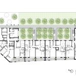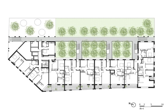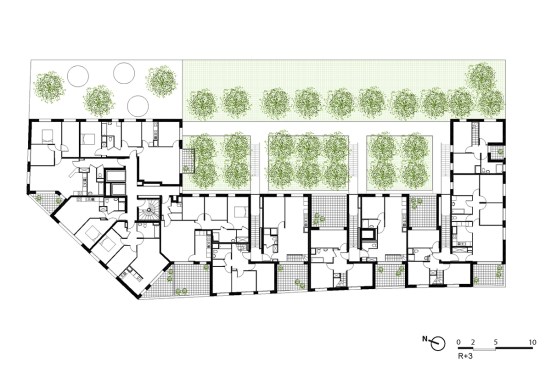 The houses and flats are raised above ground level, since the site is covered by flood prevention regulations. They are reached by means of a pathway that passes through the treetops of a ground-level park, offering residents a gentle transition between private, collective and public spaces along with a view of the entire site.