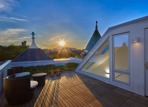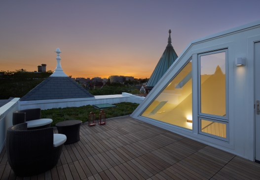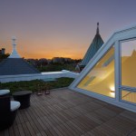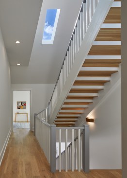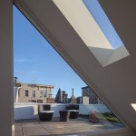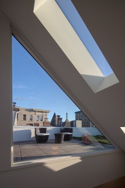 The front of the rowhouse was treated as a historic restoration project which included masonry and cornice repairs, replacement of windows, and a new mahogany custom entry door detailed to precisely match the original that was beyond repair. At the rear façade, a vertical glass and concrete slot was strategically placed to introduce light and is the only visible modern intervention at the exterior. It hints at the contemporary interior spaces contained within the building. A new open grand staircase capped by a small “lightbox” roof structure. Sculpted to stay out of line of sight from the street it drives light deep into the penthouse apartment while also allowing for access to a new roof deck that takes in glorious views Washington.