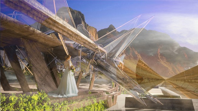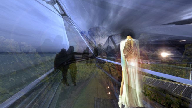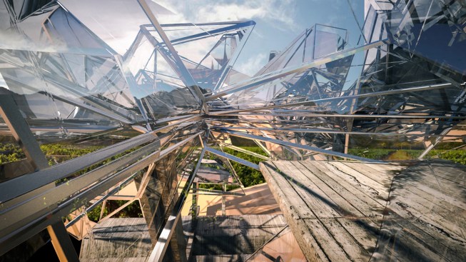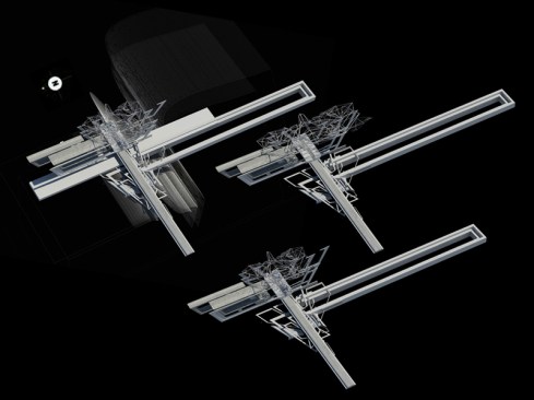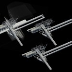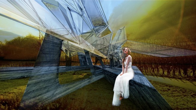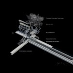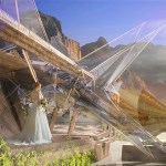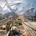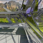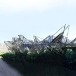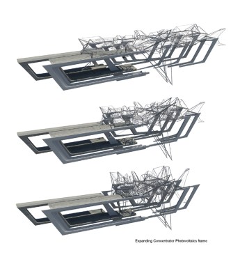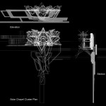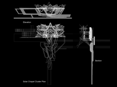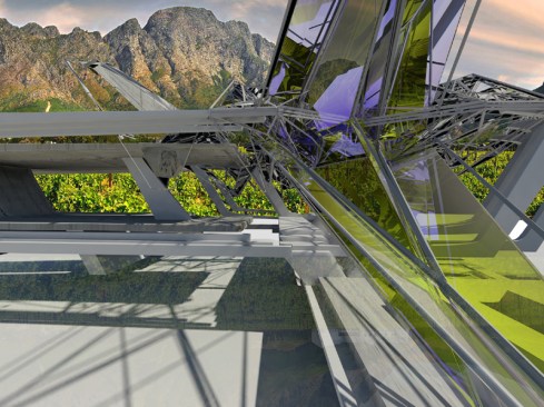 Solar Chapel at the HoldenManz WineEstate, Franschhoek, Cape Town. The project utilizes the same solar panel technology used on the farm to clad a dynamic expanding wedding chapel’s roof structure. The vertiginous mountains within the estate are reflected in the beton brut primary structure off which the concentrator Fresnel lenses, solar cells and holographic filtered panels are suspended. The solar panel arrangement is similar to the angular configuration of a butterfly’s wing which receives more exposure to solar rays affording a maximum electrical output efficiency, the steel frame sits within a track laid into the primary structure, expanding and contracting as spatially required, enabling a further rearrangement of the concentrator photovoltaic cluster. The concentrator lenses use fewer solar cells to harness the same solar energy as twice the amount without the implementation of fresnel lenses, the lenses can be programmed to follow the sun in tandem as it moves across the sky taking full advantage of available sunlight, the sliding steel frames onto which they are supported allow for more movement and maximum exposure to solar rays. Because it is vital to keep concentrator photovoltaics cool due to high concentration ratios introducing heat problems, this is when solar radiation is concentrated, so is the amount of heat produced, reducing cell efficiencies with temperatures increase, higher temperatures also threaten the long-term stability of solar cells this short term proficiency is expensive and negates the sustainability of the design, therefore it is essential for the solar cells to be kept cool when arranged within a concentrator framework, requiring sophisticated heat synch cooling designs, in this case partly pumping and using capillary action to deliver the vineyards water irrigation system along the channels of the solar panel frames, the recessed sections use this capillary action to draw water from the open pool reservoir within the chapel itself, preventing the evaporation of water through movement along the canopy structure.