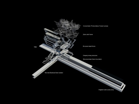 The chapel sits within the vineyard amongst an array of existing solar screens, with the help of the holographic panels it also concentrates and intensifies the solar energy which can be stored and accessed as and when required. The chapel is used for religious fellowship and is a free standing structure epitomising the duality of the monumental context and the process of wine making.