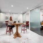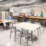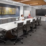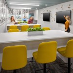 To further emphasize collaboration between staff members, the office also offers multiple break rooms with a Grab and Go market for light lunch and snack options for all to enjoy. The fifth floor includes multiple expansive coffee bars. Restaurant-style booths that can be used for dining or work purposes surround the cafe area. Due to minimal dining options in the area surrounding the building, the staff often eats lunch in the cafe and break rooms. For larger meetings, an expansive serving station sits outside of the main conference room with space for food and beverages to be housed.