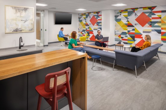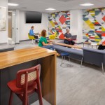 In addition to the fifth-floor office, Soliant Health also leased 32,693-square-foot space on the first floor of the building and is home to its internal staff and training purposes. This part of the project provided some challenges due to the smaller windows on the ground level. To balance the space, the design team used an extensive color palette and custom wallcoverings in the spaces on this lower level to liven up the unlit areas. All workstations are strategically positioned to be exposed to natural light. The lower level office is equipped with conference rooms, huddle spaces and breakout spaces along with its own break room and coffee bar giving staff members some of the same amenities as those on the fifth floor.