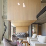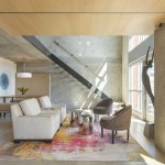 Using a vibrant Stark carpet purchased by the owners before construction started, furniture and art were selected to complement the natural material palette. Unique pieces include a custom steel and oak dining table and an upholstered bench.