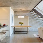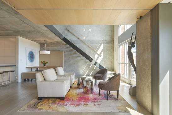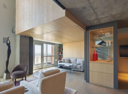 To accomplish these goals, walls & soffits were first removed to expose concrete. Now pared down to the essentials, the space was reimagined as a composition of planes and volumes in warm materials: concrete, wire-brushed and waxed European white oak, gunmetal gray panels & gallery white walls.