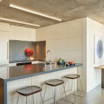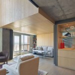 The kitchen, a compact composition of white lacquer casework opens to harbor views over an oversized island. A slender blackened steel stair of white oak treads and a frameless glass guardrail replaces the heavy original and serves as a focal point for the room. The adjacent guest bedroom features a moveable wall of hanging panels that can be hidden away, allowing the living room to seamlessly double in size.
