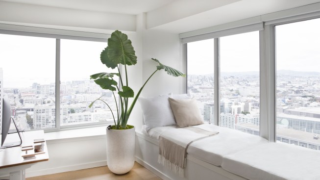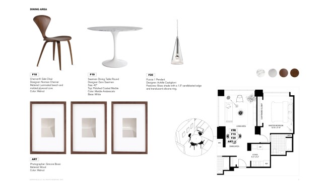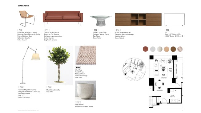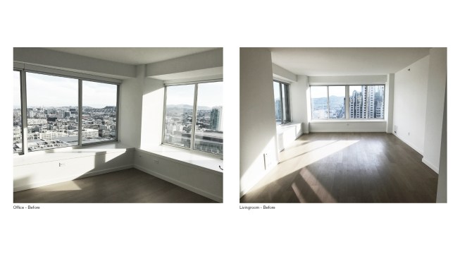 The unit is located in a tower in the heart of SOMA’s hustle and bustle in San Francisco. The objective was to break free from the intense context of the city center and create a peaceful aesthetic throughout. Furniture was selected with sensibility to the client’s aesthetic and budget, with the intention to make rooms appear open, and more spacious. At 1100 sf it was very important for the pieces and the color palettes to be well balanced with tones that complement each other in a cohesive manner. The rooms are designed in mid-century modern with hints of west coast vibes; small hints of Moroccan influenced and woven Dhurrie fabrics with light & breezy textiles are disbursed to capture relaxed California roots. At 12’ wide, the rooms felt compact thus various functions were strategically placed to make for airy and open rooms. The rooms consist of original iconic pieces of mid-century modern furniture, gathered to create a timeless aesthetic with clean lines and gentle curves; designed with minimal ornamentation exploring the juxtaposition of traditional and non-traditional objects. The rooms are nature-inspired with hints of earthy tones and plenty of indoor plants which improve concentration, productivity and help reduce stress levels for the occupants. The living room is organized around a few pieces. The sofa is not to overwhelm the room and sits gently on a floating frame, allowing for the lounge chair to find its own place in the room. The client needed a 65-Inch TV as part of the living room, which was composed to maintain balance through the addition of a rectangular walnut modular media set. The furniture pieces were picked to transcend time, with the flexibility to stay relevant beyond this space as the client steps into new horizons in the future.