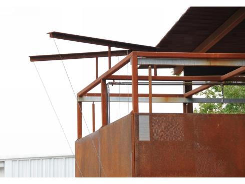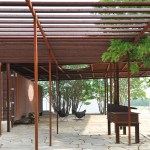 The smaller pavilion is composed of a trellis made of the same self-weathering steel as its sibling, and shelters the space between an existing bunkhouse and the main pavilion. Slightly skewed from the geometry of the larger structure, it features a barbecue pit.