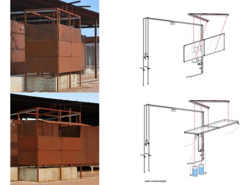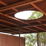 An oculus cut into the very center of the main pavilion’s roof casts wide shadows across the flagstone paving and the shipping container, marking the progression of the day. Cross-bracing cables reinforce the importance of the central void. A circular firepit sits immediately below the round roof opening, allowing the theme of warmth and light to continue through the evening, drawing users to the middle of the composition when the structure’s function shifts from cooling to warming.