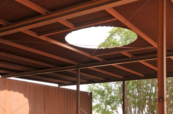While offering shaded protection from the elements, Sombreada Hasta offers generous views of the surrounding landscape of prairie grass and oak trees. It draws on a regional vernacular of simple utilitarian structures, seeming simultaneously primitive and modern.