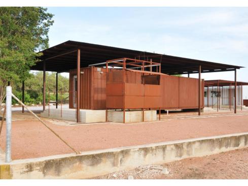 Dubbed Sombreada Hasta, or “shaded-up,” this simple 2,400-square-foot pair of pavilions designed by Midland, Texas–based Rhotenberry Wellen Architects on a ranch in Real County, Texas, refers to traditional gathering spaces for cattlemen in the region. Built between two existing agrarian buildings, the larger and taller of the two structures sits within an existing homestead plot wall. Its grid of 16 self-weathering steel columns supports a steal beam system and corrugated roof of the same material. A shipping container beneath the canopy serves as a simple bunkhouse, with storage, a sleeping area, toilet, and lavatory within its enclosure. An outdoor bathing facility sits at the north end of the structure and extends beyond the sheltering canopy’s western edge—with a water counterweight device that raises and lowers privacy panels.