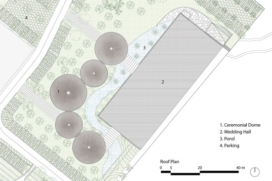 The 15.6 meters height largest dome (283 sqm) is designed for a cafe space. Two 12.5meters height domes (227 sqm each) and two 10.5 meters height domes (164 sqm each) will be used as foyer and lounge for the ceremonial halls to welcome the guests. These spaces are multipurpose space for the local society to cerebrate an outdoor event such as parties and ceremonies also.