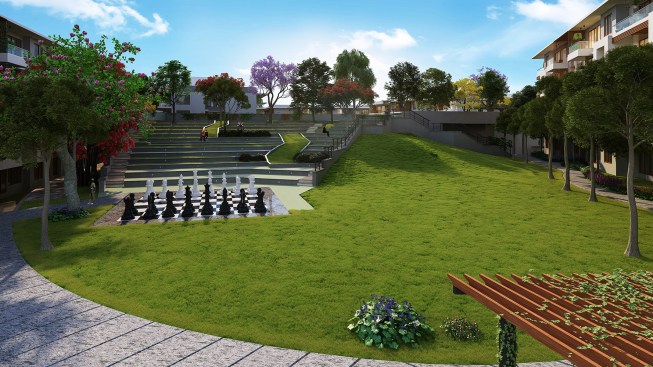 Building within the Tree-line, the masterplan lays out a mosaic of apartment towers, tree-lined boulevards, and large, intimate landscaped zones, all hinged together through a central communal garden. Focused on the creation of green space rather than creating green covers around the built form, a central green cover that spreads centrally throughout the plot was envisaged, adorned by buildings at the sides. It is this central garden that traverses the site from the far end to the central lawn and the clubhouse that rises from the ground. A series of intimate courtyards at varied scales have been articulated within the building clusters, maneuvering to create public squares within a block to encourage interaction, activity, and play. Spaces that cater to all ages have been crafted- quiet and cozy courts for senior citizens, gaming courts for young adults and families, expansive lawns and outdoor games for children, and sand pits and small play areas for toddlers, etc. Utilizing the natural terrain while seamlessly blending levels to create flowing green spaces, these adjoining green courts promote a sense of community, belonging, and identity amongst residents. To amplify the feeling of security, a pedestrian-friendly environment is created on the ground to ensure a safe, and thereby happy neighborhood.