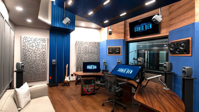 Sonic Den reflects the warmth and creativity of its owners with a futuristic feel designed to be both practical and comfortable for a wide variety of musicians and performers. Each area features a striking color scheme of royal blue offsetting wood paneling, with modern wall art to disguise the acoustic paneling and diffusers. Each room has a Phillips Hue System which provides variable lighting for complete control of the mood while tracking, recording, or playback. The live room also features a striking mural painted by Mexican American artist Teddy Kelly.