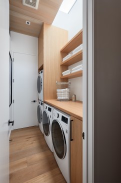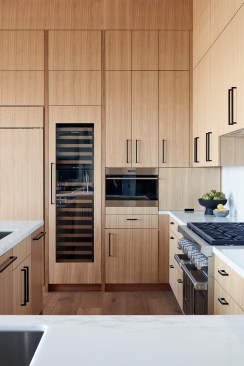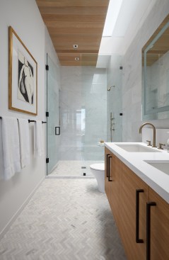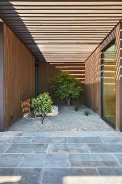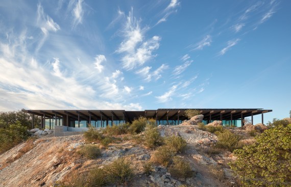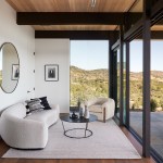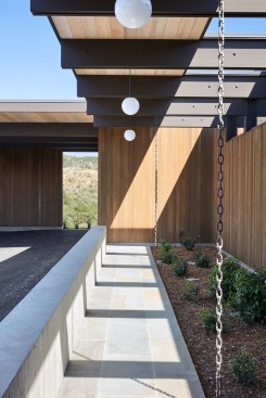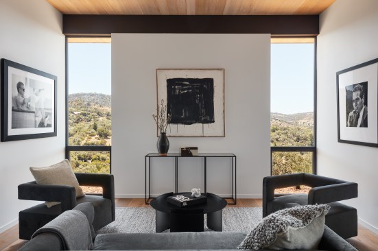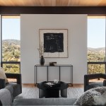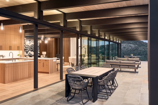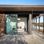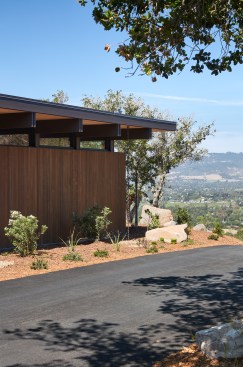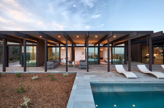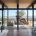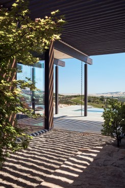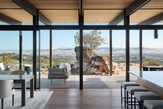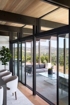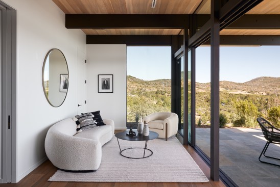 Inspired by another mid-century modern home the client owned, this new residence represents a much larger 21st-century version built into the gently sloping hillside to take advantage of the sprawling hilltop views of the Sonoma valley. The quiet front facade leads guests into a formal entry that divides the house into private and public spaces. Rounding the corner into the great room, one is immediately hit by the breathtaking view that extends outward beyond the infinity pool and deck through a continuous wall of glass. In the opposite direction, each of the three bedrooms was designed with its own seating area and bathroom, creating private suites for family members and guests alike.