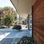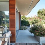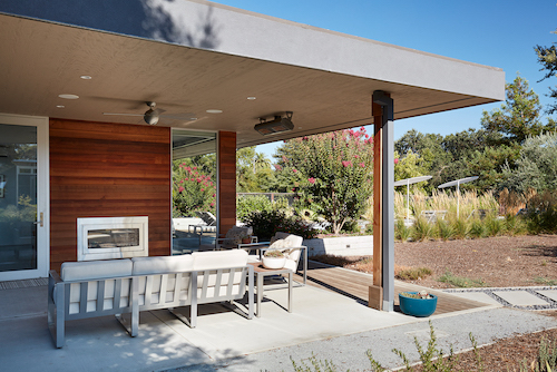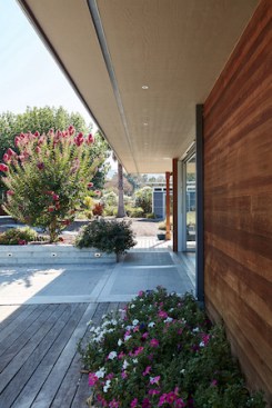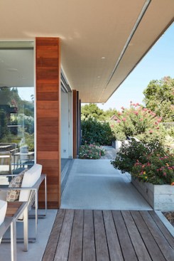 The horizontal lines of the flat roof design align closely with the linearity of the pool while large pocketing multi-slider glass doors create a void that opens the space out toward the patio and pool. The roof is extended outward on one side creating deep overhangs that provide a sense of “cooling,” welcomed protection from the hot Sonoma sun. Horizontal cedar siding continues those lines and adds a modern touch to the pool house. The same cedar decking material is installed adjacent to the concrete patio slabs creating comfortable pathways surrounding the structure.
