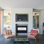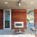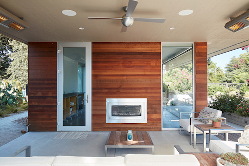 A walkway connects the main house directly into a welcoming covered seating patio, protected by deep overhangs on one side of the guest house where the family can relax even during the midday heat. At night, a double sided fireplace adds warmth to both the cozy outdoor seating area as well as the living space inside.
