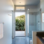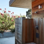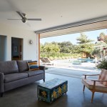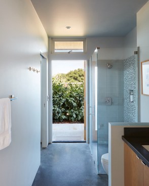 The interior polished concrete floors keep guests cool during the day and provide a seamless connection to the concrete patio surrounding the structure. Deep overhangs and flush mounted shades protect the interior space from the hot sun and provide privacy when needed, while allowing a clear view to the pool and landscaping for most of the time. The full sized bathroom is bright and airy with floor to ceiling windows that allow natural light to flood the room. A second exterior shower provides guests with a quick rinse after a cooling swim.
